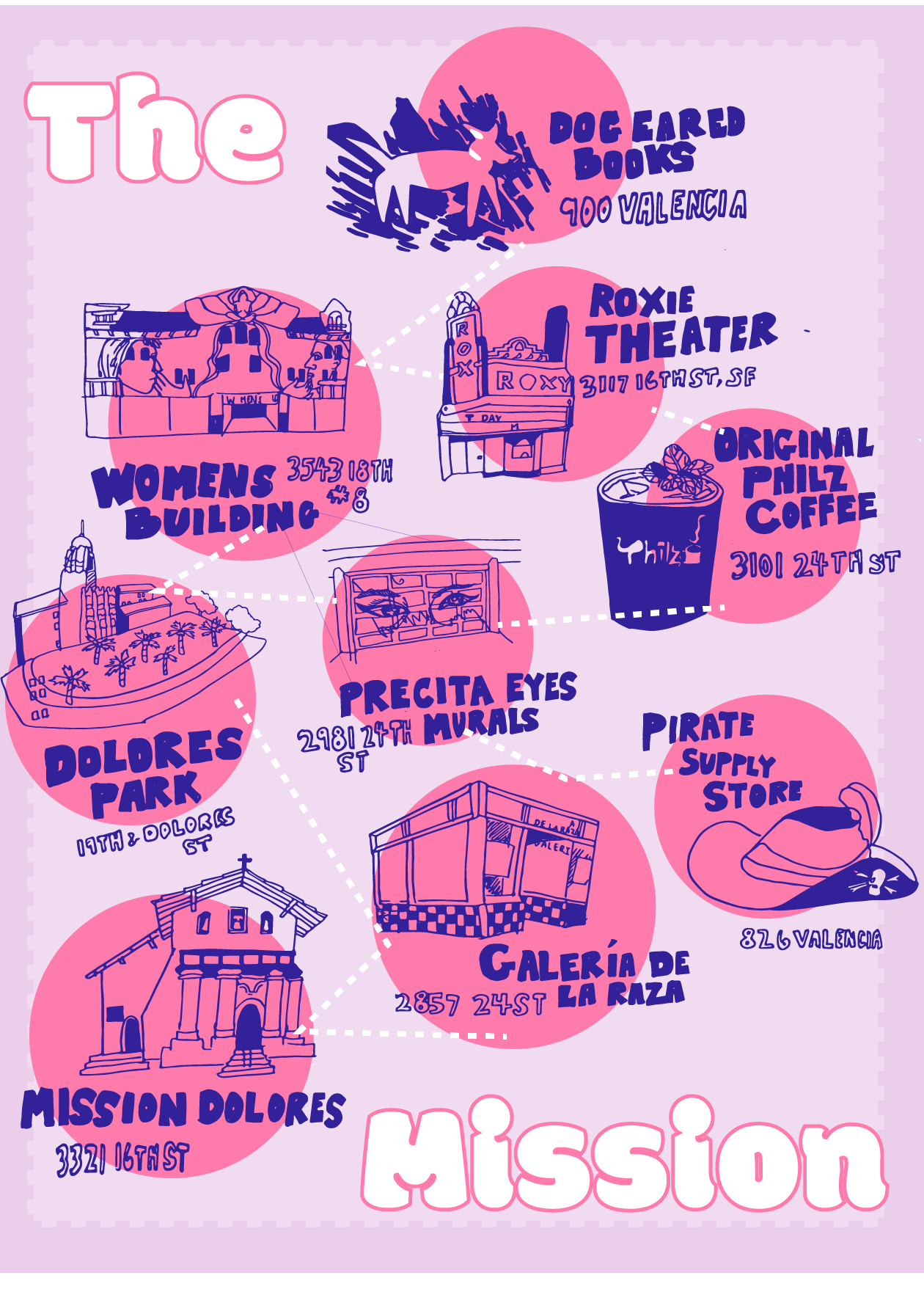 An illustrated poster that explores iconic attractions within the Mission District, particularly near 24th Street.